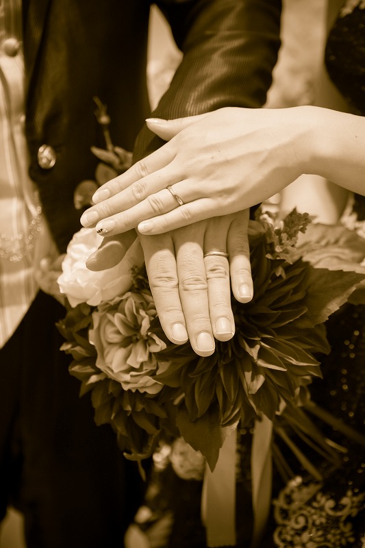 蝶ネクタイ、ブーケにドレス、会場の純白に色鮮やかな一枚♪